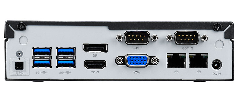 背面にはDisplayPort、HDMI、VGA、USB3.2 Gen1×4のほか、LANポート×2、シリアルポート×2も装備。POSや制御機器との接続にも最適です
