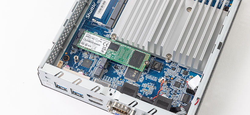 Serial ATA(6Gbps)に対応した2.5インチHDD/SSDを1台内蔵可能。さらに、M.2 M Key(Type 2280)スロットを備え、NVMe対応SSDも搭載できます。システム用とデータ用にストレージを分けた柔軟な構成が可能で、高速性と大容量の両立を実現します。