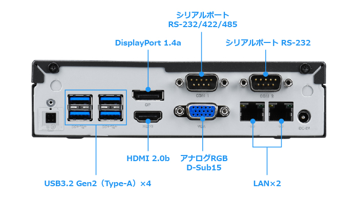 背面にはDisplayPort、HDMI、VGA、USB3.2 Gen1×4のほか、LANポート×2、シリアルポート×2も装備。POSや制御機器との接続にも最適です