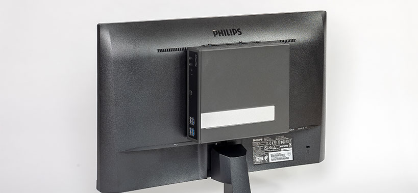 外形寸法が幅165×奥行き190×高さ43㎜とコンパクト。ファンレス仕様で動作音もほとんどしないため、場所を選ばず使えます。標準でVESAマウントが付属しているのもポイント。液晶ディスプレイやテレビの背面に設置できます。